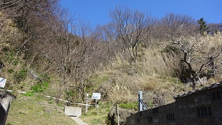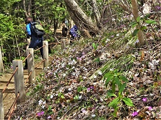 2016年03月27日(日)3回 門前町深見より「猿山」往復 5年ぶりの「猿山」である。もちろん雪割草が目当てだ。前回二度は娑婆捨駐車場から登ったが、今回は深見集落から登る予定。歩く距離がだいぶ長くなり、海岸から登るので標高差も高くなる。小松より高速道路、金沢東で降り国道8号を直進し、白尾で、のと里山海道に乗り、西山ǐCで降りて、外浦を国道249号で走る。門前の方へ曲がらないで海岸線をすぐ走ると、突き当りの「門前町深見」に到着。前回は3時間掛かったが、今回は深見までは2時間半位で10.00時に到着。 ![]() 特に駐車場は無いようで、係員が道路に順番に路肩駐車をさせている。突き当りが集落で、その背後の山に登って行くようだ。 ![]() 村の海側にトイレがあり、その先は漁港。橋を渡り右に進むと協力金支払い所、300円払い進むとすぐ山へ入る道がある。 ![]() 「のと猿山雪割草の道」の標識がある。猿山灯台まで「3.4km」と書いてある。道に入ると、直進するコースは崩壊のため、右の急坂コースを登るよう指示されている。急斜面に付いたジグザグ道を登った行く。今日は天気が良い。10.35分。 段々と深見の集落が下になってくる。 ![]() ![]() 11.00頃、坂を登りきると平坦な道になる。前を行く人がしゃがんで写真を撮っている。所々に雪割草が見えてくる。子供連れだ。 ![]() 一度少し下がって谷を渡る。小さな滝がある。 ![]() 海が見えてくる。やがて雪割草の咲くゾーンに入ってくる。「ǐ」地点に案内板があった。 今日は「J」より入り、「I」より「F」に至り、頂上「H」を往復。「G」より「C」を降り灯台で昼食。戻りは「C」より直接「F」に出て、深見「J」に戻る予定。 ![]() 「I」の雪割草群生地は初めてであるが、なかなか多く咲いて居る。 ![]() ![]() ![]() ![]() ![]() ![]() ![]() ![]() ![]() ![]() ![]() ![]() ![]() イカリソウ ツバキ エンレイソウ ![]() 群生地を過ぎてから「F」地点までは、なかなか長かった。谷まで一度降り、最後は中々の急坂だった。急斜面にかけられた木の歩道は、傾いたり、朽ちたりしている。 12.05分に「F」地点に到着。娑婆捨峠からの道と合流する。 右に折れて急坂を頂上を目指す。向こうに見えてきた山が頂上である。 ![]() 頂上へ至る道は「キクザキイチゲ」がいっぱい咲いて居る。 ![]() 12.25分に頂上到着。食事しているパーティ。展望なし。三角点にタッチして、すぐ「G」地点まで戻り、急斜面の雪割草群生地を降りて灯台へ行く。ここの群生地もなかなか良い。 ![]() ![]() ![]() ![]() ![]() ![]() ![]() ![]() ![]() ![]() 13.00時に灯台へ到着。昼食。遠くに猿山頂上が見える。 ![]() ここから直接「C」から「F」地点へ登り、深見へ下りた。15.00時に車までたどり着いた。 ![]() ガソリン補給で国道まで戻り、総持寺の方へ進むとスタンドがあった。ついでに総持寺祖院まで行き参拝してきた。昨日今日と「雪割草祭り」で門前を通行止めにして蕎麦の屋台などが出ていたようだが、3.30分でかたずけに入っていた。 ![]() 境内に「峨参道」の標識があった。能登の山を歩いて居ると峨山道の良く出会うし。近くの「峨山」にも登った事がある。 ![]() ★次項2016年の26回登山は、3/29日「尖山」へ★ |