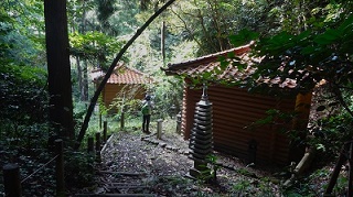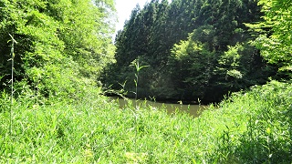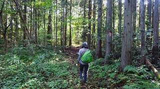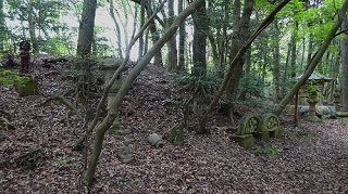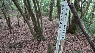 三角点は尾根の一番高い所に鎮座している。すぐ下の広場に色々と建築物と手作りあずま屋がある。 ![]() 戻って縦走開始。まず「大坊谷上遥拝所」への分岐があり入り込む。手作りのあずま屋があり、白山の方が少し開けている。晴れていれば白山も見えるだろう。 ![]() すぐ戻って尾根を進むと「温谷寺跡」に出る。何もなく案内板があるだけである。白山を信仰する一大宗教センターがあったと書いてある。温谷寺は「うたにでら」仮名が打ってある。 ![]() 大木が何本もあり、寺院があった名残と思われる。 ![]() 「高宮白山神社遥拝所」を通る。ここからも「白山」は見えるだろう。この場所の丁度下の宇谷町に「高宮白山神社」がある。 ![]() 「毘沙門上遥拝所」の分岐があるので寄る。この遥拝所はペンチがあったが、木が茂ってきて白山の方は全然見えない。戻って縦走開始。 ![]() 南谷分岐に出る。栄谷寺跡の方へ進むのだが、荷物を置いて、参道登り口の方へちょっと降りる。 ![]() 栄谷・行者窟が一つだけある。ここまで行って戻る。一筆書きで間が抜けぬようにする。 ![]() 分岐まで戻り、栄谷寺跡の方へ進む。 ![]() こちらにも、栄谷行者窟群がある。山肌に行者窟が幾つも並んでいる。尾根を進む道もある。 ![]() 分岐に出る。右が漆谷奥の院遥拝所、左が漆谷栄谷寺中心伽藍跡である。奥の院遥拝所まで往復する。 ![]() ピークより段々下がった突き当りに、奥の院遥拝所があった。ベンチがあったが周りはすべて樹木に覆われて、白山は見えそうでない。 ![]() 分岐まで戻って今度は、栄谷寺大伽藍跡の方へ進む。 ![]() 右の少し平らな所に入ると、そこが栄谷寺の中心だったらしい。立札があるのみ。 ![]() 戻って、縦穴大行者窟の方へ降りてゆく。ここから先は一度降りてしまうので今まで入ったことが無い。 ![]() だいぶ降りたらロープで囲んだ、縦穴行者窟があった。初めて見た。とても深い穴である。 ![]() さてここから、ルートが判らなくなった。案内板の地図では方向を変えて、右の斜面を降りる様だが、結構急斜面、直進する尾根筋は緩やかで、しかも道が付いているように見える。尾根を降りた方が近道にもなるので直進した。初めは良かったが段々と道らしくなくなった。なんとか下まで降りたが、川のふちで湿地帯に降り立った。泥にはまり込みながら、何とか作業道に上がり込んだ。作業道にを少し降りると地図に載っている池が見えた。 ![]() 500mも作業道を歩くと、栄谷寺跡入口の大きな看板がある。ここがアカメ谷参道の登り口である。ここへ降りてきたことはあるが、ここから登るのは初めてである。この辺りから水田になる。 ![]() 寺の下参道入口の標識もある。 ![]() 広場の白山遥拝所がある。ここにもベンチがあるが、木が茂っていて展望は無し。ベンチで遅い昼食。 ![]() 登って来たアカメ谷参道と、牛谷参道の合流点に到着。ここから牛谷参道を降りるのだが、その前に荷物を置いて行者窟まで往復、道を繋げる。 ![]() 牛谷参道は緩やかで気持ちの良い道である。 ![]() 牛谷参道の登り口まで降り立ち、作業道を降りてゆく。 ![]() 今度はカタクリ群生地の方へ入り込む。 ![]() カタクリ群生地は円山古墳の斜面にある。もちろん今は咲いていない。 ![]() カタクリ群生地を抜けて、また温谷寺の方へ登り出す。 ![]() 鞍掛山が見えるぞ。 ![]() 尾根を進むと、昼一番に出発した「宇谷山三角点」に戻り着いた。 下の広場から、目の前の高台に三角点がある。 手前の道で降りる。この道は石仏の並ぶ道である。 ![]() ![]() ![]() ![]() ![]() ![]() ![]() 15.30分に車に戻り着く。携帯歩数計は6.500歩。なんとか一筆書きでほとんどのコースを歩いた。誰ひとりとも遇わない、3時間半の老人徘徊だったな。 ■次回登山は、6/21能登「宝達山」へ■ 2020年06月13日(土)6回 ほとけの里-「宇谷山」往復 私が勝手に名付けた「宇谷山」。何度か歩いているがまだ様子が判らない所がある。一度、いっぺんにに全部のコースを一筆書きに歩こうと考えていた。「ほとけの里登山口」より入り、「温谷寺跡」へ。そこから上の地図には載っていないが、「栄谷寺跡」から「大行者窟」を通り一度作業道に降りる。今度は「アカメ谷参道登り口」より登り「牛谷参道登り口」へ降りる。今度は「カタクリ群生地」から「ほとけの里」に登り、「ほとけの里登山口」へ降りる。 ![]() お弁当作って「ほとけの里」に車を置く。段々と雨が止む予報なのに全然降りやまない。車の中でゲームをしてりして暇をつぶしていたが、なかなか降り止まない。とうとう諦めて、今日はせめて「宇谷山三角点」まで、と考えて傘をさして13.00時に歩き出す。 ![]() 獣除けの門を開け閉めして入る。花菖蒲の咲く池に、モリアオカエルの卵がぶら下がっている。 ![]() 分岐になる。どちらからでも一周できる。今日は左から登る。 ![]() 尾根上までに、二つの手作りあずま屋がある。 ![]() 尾根の上まで登ると、一番高い地点に「三角点」がある。 ![]() その