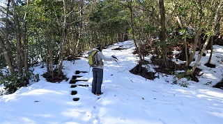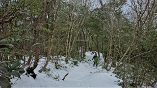 点名が宇谷なので「宇谷山」にしている。一段下の広場や尾根道に、ほとけの里の祠や石仏、供養塔などが多数並んでいる。 ![]() 11年前に三角点探訪に来た時は、何も無かった。 「温寺寺跡」の方へ進む。 ![]() 右に「白山遥拝所」がある。覗いて見る。山の方が切り開かれている。今日は白山は見えなかった。 ![]() 「温谷寺(うたにてら)跡」に到着。特に何もなし。尾根の上の広い場所。平安時代から室町時代に掛けて栄えた寺院跡。隣接する「栄谷寺跡」と共に、一大宗教センターがあったと書いてある。 巨大な「スタジイ」の木の横を降って行く。 ![]() ![]() 「高宮白山神社・白山遥拝所」を通る。高宮神社は地図を見ると、丁度この地点の麓にある。 ![]() 分岐を直進する。分岐の左下には「温谷寺・行者窟」がある。今日は寄らず直進。 ![]() 「栄谷・行者窟群」がある。斜面に穴が空いている。壊れかけの物が多い。 ミヤマシキミ ツバキ オウレン ![]() ![]() ![]() ![]() 分岐から最奥の「奥ノ院遥拝所」を往復する。 ![]() 奥ノ院はあまり人が来ないようで荒れていてベンチがあるのみ。山は見えない。 ![]() 分岐まで戻って「栄谷寺跡」の方へ降りる。栄谷寺大伽藍跡を通る。広い場所があるが何も無し。案内板だけ。 ![]() 先を降って行くと「栄谷寺・縦穴行者窟」がある。深い縦穴が一つ空いている。深くて底が見えない感じ。途中の案内板にはここから林道へ降りる道が書いてある。しかし急斜面で道が見えない。仕方なく前回の通り直進する獣道を降りる。 ![]() 前回の通り湿地帯に降りた。二人でウロウロと泥にはまらぬように、彼方此方歩き回り、小川に倒木で橋を架け、無事脱出、林道に出てホッとする。日の当たる林道の真ん中に座って昼食。 ![]() 林道を少し降ると「栄谷寺跡登り口に出る。ここからまた登り返す。 ![]() 杉林を登り切ると「白山遥拝所に出る。 広場になっていて白山の方が切り開いてある。かすかにかすかに雪山が見える。薄くて良く見えないが白山らしい。老人は目も悪いな。 ![]() ![]() 緩やかに登って行くと、栄谷町の方から「牛谷参道」が登ってきている。 ![]() ここを今日は降りる。 オウレン 幹のくっついた木 アセビ ![]() ![]() ![]() ウスタビガの繭 ヤマザクラ クサイチゴ ![]() ![]() ![]() ![]() 牛谷参道の登り口まで降りてきた。 作業道を栄谷町の方へ降りてゆく。リュウキンカの群落がある。 ![]() ![]() 民家の近くから、「宇谷カタクリ群生地」に登りだす。 ![]() 群生地は手入れがしてあり、カタクリの葉が見えるがまだ咲きそうでない。群生地を抜けて参観店のあるほとけの里に、2度目の登り返し。 スミレ キクザキイチゲの青 ![]() ![]() ![]() ![]() 尾根まで登り進むと、鞍掛山が見える所がある。 ほとけの里の三角点に戻り着き、反対側の周回道を降りる。 三角点 ヒュウガミズキ 植えてあるウメ ![]() ![]() ![]() 収蔵庫らしき建物の横を通って降りる。誰一人歩いていなかった。三箇寺のもう一つは「那谷寺」であり、廃寺とならず再興している。 ![]() ![]() ■次回登山は、3/2加賀「差谷山へ■上の項 2021年01月20日(水)8回 「法皇山」 散策 久方ぶりの快晴。相棒S女史と今年初登山を予定していたが、へぼ用が出来て出発が午後2時になってしまった。ちょっとだけでも歩こうと、小松の勅使町の「法皇山横穴古墳」にやってきた。終い忘れていた「輪カンジキ」も引っ張り出してきた。資料館の駐車場は除雪がしてなく、道路に車を置く。背後の法皇山は、山の中に入るとあまり積雪が無いように見える。 ![]() ![]() カンジキを着けるか迷ったが、長靴だけで入り込む。遊歩道を少し進む。右に戻るように山に入る。 ![]() 横穴を見ながら登って行く。 ![]() 順路4番の標識。順路通りに歩く予定。 ![]() 遊歩道は、駐車場側の斜面を横切り、一度山の反対側の広場に降りる。順路7番の標識。 ![]() ここからまた戻るように、今度は一番高い地点に登る。階段がある。 順路10番の頂上に登り着く。案内板に着けてある小さな案内図。 ![]() 海の方の風景。 ![]() ![]() 次の11番は、頂上の先を降りた広場にある。この広場にも横穴が幾つもあった記憶があるが、良く見えない。遊歩道は行き止まりで、7番広場まで戻るように指定されている。 ![]() 頂上まで戻ってコーヒータイム。いつもありがとうございます。 ![]() 7番広場から、今度は駐車場の反対側の斜面を行く。順路12番標識。 ![]() 右に池がある様だ。池の方へ降りてゆく。 ![]() 池のふちより田んぼの方へ降りる道がある。順路14番の標識。急坂でS女史はシリセードを試みようと、敷物を出して滑ろうとしたが、雪が柔らかで沈みすぎ、階段もあって全然滑れない。 諦めて降りて行った。 ![]() ![]() 横穴が幾つも並ぶ山裾で戻る。横穴は、今から約1400年前の、6世紀から7世紀に造られた群衆墓とかいてある。 ![]() 帰りに国道へ出る途中の「さえぐさの里」で白山を撮ってS女史と別れた。この駐車場も除雪してなかった。 ![]() ■次回登山は、1/23加賀の「おくりび