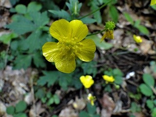 2019年05月30日(木)2回 8.00時に加賀ゆめのゆに集合。相棒K君とS女史の三人のパーティーで、今日は「大師山」である。この間から福井の山に登って居る。大師山も9年ぶりの登山である。山中温泉を抜けて、高速道路を使わずに勝山へ行く。高速を使っても、あまり時間の節約にならないみたいだ。越前大仏のの後ろにそびえるのが「大師山」である。越前大仏清大寺の裏の、片瀬町の「佛母寺」の下の駐車場に車を置く。迷わずに入り込めた。林道の突き当りで3.4台置ける。イノシシ除けの柵があり。開け閉めして林道を歩いてゆく。林道はそのまま登山路になって行く。![]() ![]() ![]() 白いコアジサイ タツナミソウ ヤマツツジ ![]() ![]() ![]() ツルアリドオシ タツナミソウが多い。 ![]() 気持ちの良い登山道である。5合目の石標通過。 ![]() タツナミソウは「シソバタツナミソウ」の表示があった。 ![]() 尾根の上に登り着く。前坂という表示がある。 ![]() 尾根歩きとなり、明るい感じとなる。相棒K君に抹茶を点ててもらって休憩。 7合目石標通過。 ![]() ![]() ![]() ニガナの白花 ニガナの黄花 ナルコユリ ![]() 10.55分に、大きな杉に囲まれた、小さな「大師堂」に到着。泰澄大師が像を収めたらしい。 ![]() ここは9合目の石標がある。 11.15分に頂上到着。勝山市街が見下ろせる。方位版があり山名が載っている。 ![]() ![]() 下に恐竜博物館。右上は越前甲山らしい。 ![]() ![]() 報恩寺山とスキージャム勝山 ![]() 頂上の一番高い所に、石の六角灯籠と、そばに2等三角点がある。ゆっくりと昼食。 ![]() 頂上まで裏から古い林道が登ってきている。地理院地図には、登山道と林道が交差して載っているが、昔の登山路が使われなくて廃道となり、いろいろと変わっている。 ![]() 林道歩きが楽なので、登山路が廃道になって居る様だ。林道を歩いて降りながら、登山路らしきものを探してゆく。 ![]() ![]() ![]() ![]() うまい具合に、車を置いた佛母寺の裏にたどり着いた。13.40分に車に到着。 ツレの二人がまだ「越前大仏」を拝観したことが無いというので、拝観に行く。 ![]() 五重塔の後ろの山が、先ほどまで居た「大師山」である。 ![]() 奈良の大仏よりも大きいと云う大仏。 エレベーターで五重塔に登る。大仏殿の向こうの山は「荒島岳」らしい。 ![]() ■活動時間 4時間26分 ■活動距離 4.3km ■高低差 369m ■累積標高501m/505m Ⓢスタート 9.17→1時間56分→大師山11.13-12.18(1時間5分)→1時間26分→ Ⓖゴール13.44分 ■次回登山は、6/4福井県「吉野ヶ岳」へ■ 2010年05月29日(土)初登山 「加賀の里山逍遥」のページも、県境を越えて福井にも入り込んできた。石川県境から続いている福井の山も、九頭龍川までは、加賀の里山に入れている。この「大師山」もそうである。 ![]() 福井県勝山市の「越前大仏」の借景となっている山である。今日は一人。小松より8号線を走り、山中温泉を抜け、大内トンネルを越えて、永平寺町より九頭龍川を遡り、勝山市に入り、白峰からの国道157号線に合流して、しばらく走ると、左手に「越前大仏清大寺」の大仏殿と五重塔が見えてくる。その背後の綺麗な山が「大師山」らしい。8.00に着いた。 ![]() この清大寺の右奥に「片瀬」と言う集落がある。集落のはずれの山裾に「佛母寺」と言う寺がある。そこが登山口になっている。入る道を一本間違えたのか、細い村の中の道をうろうろする。 ![]() ようやく佛母寺に到着。寺を通り過ぎた所に駐車場があり、5.6台留められる。お寺の駐車場かも知れない。すぐ前が越前大仏の大仏殿である。寺の周りを散策する。寺の右に、森林浴コース入口の標識がある。境内に句碑が多い。立て札に拠れば、勝山の俳句発祥の地であり、ここは文人墨客の曾遊の地である。との事。 ![]() 8.30.入ってきた林道をそのまま進む。「シャガ」が咲いている。 ![]() 林道はしばらくすると山道になる。黄色い小さな花は、調査中。「コナスビ」かな。 ![]() 道は深い溝になっているところが多い。昔からよく歩かれているようだ。「ムラサキヤシオ」が咲いていると、案内書に載っているが、このツツジではないようだ。 ![]() これは何。「ママコマ」とも違うようだし。 ![]() 9.05.峠の上に到着。ここは「前坂」と言う地点らしい。四角い標識には、前坂の右面に「大師山伏拝」と書いてあり、左面に「三谷」と書いてある。大師山伏拝とは、大師山の頂上の事だろう。峠を越えて下がってゆくと、三谷に出るのかなと思ったが、地図にそんな名前は無い。 ![]() 峠より右に尾根道を登ってゆく。これは「キツネノボタン」かな。 ![]() この葉がよく目立つ。「クルマバハグマ」らしい。 ![]() 9.30.大きな杉林に出たら、「大師堂」に出た。小さな祠が建っている。泰澄大師の尊像を安置するために、創建された、と書いてある石碑がある。本には泰澄大師自作の像が収めてあり、大師山の名前の由来である、と載っている。 ![]() 9.50.広い頂上に到着。三角点が在り、横に石の六角灯篭がある。古いものらしい。