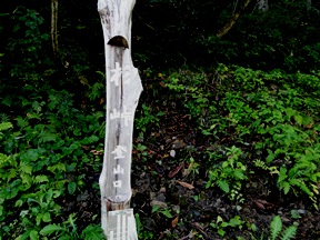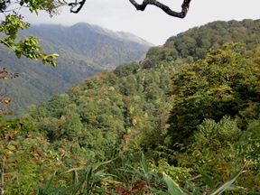 2010年10月16日(土)初登山 三ッ谷川分岐より往復 友達のH君が「杉峠」に登ってきました。とメールをくれた。彼は今夏も、福井の刈込池から「三ノ峰」を登っている。だから刈込池から尾根まで登り、三ノ峰と反対の杉峠に行ったのかと思ったら、今度は「市ノ瀬」手前の三ッ谷川の方から入ったという。なるほど調べると、去年私もここから「赤兎山」に登っている。途中の林道三叉路を、左に少し入った所に、杉峠への登山路が地図に記入してある。友達は峠まで130分だと言った。ならば私でも登れそうだと思った。しかも「杉峠」のピークに三角点があるのを発見。三角点を探して「杉峠山」と名付けようと出がける。 ![]() 8.50.尾口村の「道の駅瀬女」に集合。最近のフルメンバーがそろった。ハッスルSN女性コンビに、N氏。我々70越えコンビの5名である。白峰から市ノ瀬へ向かい、市ノ瀬手前の、三ッ谷川の橋を渡って右折し、林道を遡る。林道入り口のロープは外れていた。しばらくで三つの谷の合流点に着く。林道は左右に分かれ、、右は「小原峠」への道。左は「杉峠」への道である。左のロープを外して進むと、突き当りに建物があり、直進する道はロープが掛かっている。左に曲がる林道もある。地理院地図ではここらあたりに登山路が在る筈なので、建物の人に尋ねると、左にもう少し進みなさい、と教えてくれた。 ![]() 地図では尾根の突端より登山路が付いているが、今は林道を150-200m進んだ地点に、右の斜面を登る登山路が在った。道が広くなった所に車を置く。もっと先にも大きな駐車場があるらしい。「杉峠登山口」の標識がある。下に「この道は、白山杉峠道を守る会が、ボランティアで草刈りをしています。通行の際は、自己責任でお願いします」と追加の張り紙がある。草刈りありがとうございます。 ![]() 9.00.より登山開始。入ってすぐ林道と平行して走る道に入って、あわてて戻る。赤い札の下った直進の杉林の斜面を登る。 ![]() これは「アケボノソウ」らしい。アップで撮ってねと言われたのにピンボケですみません。 ![]() 尾根まで登ると、広いが急な尾根を登って行く。白山禅定道の雰囲気がして、気持ちが良い。 ![]() ヒノキとブナがくっついた木がある。古木が多くて素敵な道である。 ![]() 9.50.「別山展望台」の標識に出る。 ![]() 登山路の左が切り払われていて、別山が望める。三ノ峰の方が別山よりも大きくて立派に見える。 ![]() 10.45.今度は「白山展望台」の標識があった。ここで抹茶休憩。 ![]() 「白山」は残念ながら雲の中である。 ![]() 「別山」「三ノ峰」はさらに近づいて、恰好良く見える。 ![]() ここら辺りから、広いなだらかな地形になり、ブナの大木が多くなる。 峠が近ずくと、ブナ林が少し紅葉してきている。いい感じ。 ![]() 11.55.ようやく「杉峠」に到着。友達の言った130分は、軽くオーバー。170分は掛かった。 ![]() 大きな標識がある。右に行けば「赤兎山」。左に行けば「三ノ峰」。登ってきた道の方に「杉峠→三ッ谷」と書いてある。直進して峠を下ってゆく切り開きがあり、赤い切れが下がっている。刈込池の方へ降りる道があるのかも知れない。 ![]() 三ノ峰の方へ100mほど進んで、道が高くなった所で、登山路に陣取って昼食。ここら辺りから、左の方へ入ると三角点がある予定。 ![]() 食事を済ませて、地図で方向を確認、全員で藪に突入。登山路よりは100-150m程入った、小さなピークにあるはず。各自適当に進みすぐバラバラとなる。ヤッホーと声が聞こえる。一度下がって溝を越した先にピークが見えたので登って見る。酷い藪の斜面を登り切ったら、切り開きがあり三角点が鎮座していた。一番乗りだ。大声で全員を呼び集める。 ![]() ようやく全員がそろった。大分別の場所まで行った人がいた。杉峠と言うだけあって、近くの西と北に、大きな杉の木がある。