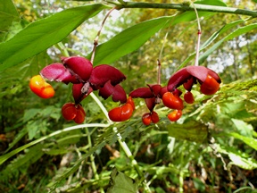 ![]() 道が無いので登る人は居ないと思ったのに、色々とテープや札が下がっている。三角点探訪のコマQさんも、ごく最近登られたようだ。私は勝手にこのピークを「杉峠山」にした。勝手に名前を付けて、また叱られるかな。自分だけ名前ですので悪しからず。 ![]() 展望は無いが、よじ登ったら東に、三ノ峰らしきものが見えた。 ![]() 帰りは全員そろって、食事をして荷物を置いたいった場所に無事たどり着いた。13.40.峠標識で記念撮影をして下山開始。 ![]() 「ダイモンジソウ」が咲いている。 ![]() この真っ赤な実は「ツリバナ」と教えてもらった。ほかの山でも見た事がある。また新聞に「ツチアケビ」として載っていたのにも似ている。 ![]() 下っていると左手に「大長山」が見える所がある。 古い「ヒノキ」が何本も生えている所を通る。15.30.に車まで降り立った。下りは、110分で降りられた。途中赤兎山を回って下山する人に遇った。皆さんの健脚に感心する。 ![]() 白峰の天望の湯に入って帰る。 |