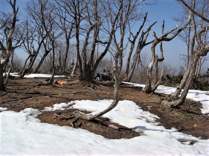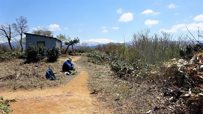 12.50分に頂上到着。5日前とは大違い、雪が消えて地面が出ている。お天気が良いので小屋へは入らずに、外の陽だまりで昼食。