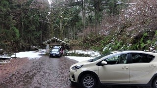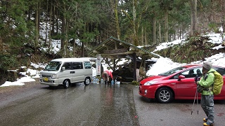8.30分に瀬領町の「せせらぎの郷」で合流して、下大杉町の、動山登山口の「弘法水」に9.00時に到着。水汲みの車が一台だけ止まっているだけ。登山の車が一台も留っていない。あまり雪が積もっていない。長靴は歩き難いので、いつもの登山靴で登ることにした。一番に出発。