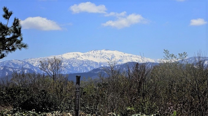 他の山から動山を見ると台形に見えるように、頂上は広い。まず目に付くのは「白山」。今日は天気が良くてよく見える。大日岳もまだ雪が残る。鷹落山へ続く道が方位盤の横より降りている。