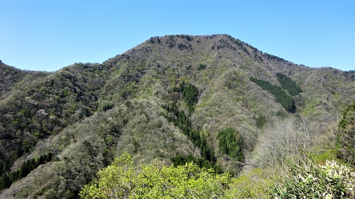 鷹落山を出発して1時間半の、午後1時に「動山」の頂上に着く。振り返ると越えてきた鷹落山が大きい。