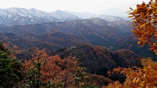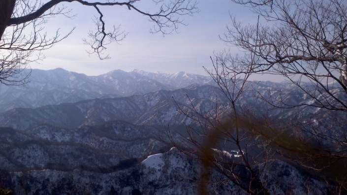今日は久しぶりに天気が良い。右手に鈴ヶ岳・大日山から富士写ヶ岳まで見えるが、木の枝が邪魔で良く見えない。