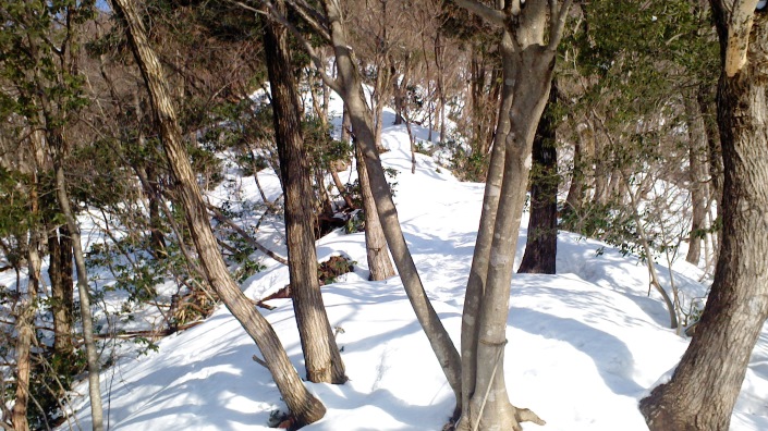 登山路に戻ると積雪があるようになった。足跡があり靴が潜るようなことは無い。