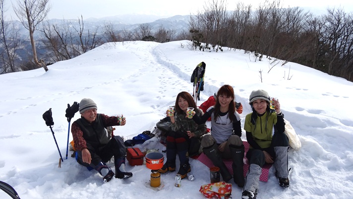春は急ピッチで近ずいている。純白の白山は何時見ても神々しい。コーヒーカップを片手に、頂上を歩き回り眺望を楽しむ。一時間ほど居て「鷹落山」に向けて出発。