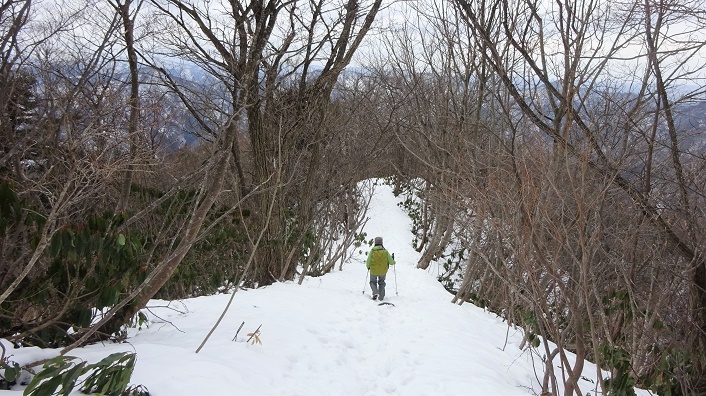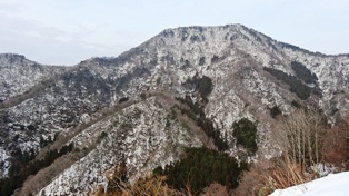 いきなりの急登で防雪の森を抜けると、なだらかな気持ちの良い尾根の雑木林になる。途中左に台形の動山頂上が望める所がある。右の林の間より、兜山、鈴ヶ岳、大日山と望める。歩き出して1時間で、頂上より大杉青年の家へ降りる主尾根にたどり着く。左折して頂上を目指す。最後はなかなかの急坂である。