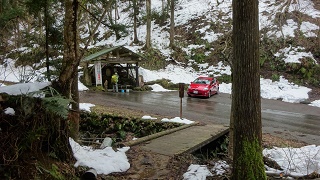 一月の厳冬期ののハズだが、今年は雪も無いし暖かい。4回目の「動山」に登ることにしたが、積雪の具合が判らない。多分カンジキも要らないだろうと、K君と小松市瀬領町の「せせらぎの郷」立ち寄り湯の広い駐車場で待ち合わせ。8時20分に私の車に乗り換え、8時40分にはもう大杉町の「弘法水」の水汲み場に着いた。県道のバス乗り場から歩く覚悟だったが、林道の脇にチラホラと雪が残るだけで水汲み場まで難なく到着。今日はまだ誰も登っていない様だ。しばらくして老夫婦の水汲みの車が入ってきた。