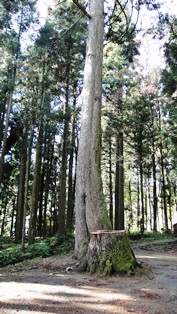 15年前に来た時は境内に「夫婦杉」があった。その後、一本枯れて立っていたが、今日見たらその一本も枯れたようで、木株だけになっていた。この神社から車道を歩いて、水汲み場の車まで戻らねばならない。