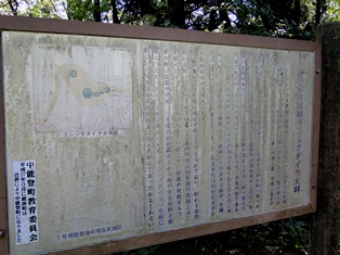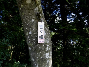 ![]() 向こうに2号古墳が見える。平野が見下ろせる。下の村から登ってくる道に鳥居がある。能登一円の村々に崇拝された山のようで、現在でも集団で登る風習があるようだ。 ![]() 雷ヶ峰の山名札は、神社の後ろに提げた。 ![]() さて「雨の宮林道」を戻るのだが、地図を見ると林道脇に三角点が在るので確認に行く。三角点のある地点は崖になっており登れない。少し戻って案内板の前に車を置く。この案内板を読むと、ここに「テンジクダイラ古墳群」として五つの古墳があるとの事である。一番高い所は雷ヶ峰に次ぐ二番目に標高が高いらしい。 ![]() 案内板の上が1番古墳で、2番3番4番と進み、一番高い5号墳の上に三角点を発見。