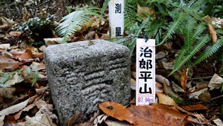 2012年11月29日(木)初散策 細呂木町より「治郎平山」三角点往復 国土地理院の2万5千分の1の地形図「大聖寺」に載っている「三角点」を、暇なときに少しずつ探して訪れている。この地図中に「二等三角点」は一つしかない。加賀インター近くの「右」と云う三角点である。地図には名前は載っていないが、点の記に通称「大蛇山」と呼ぶ、と書かれているので、大蛇山にして付近の三角点も集めて載せている。 ここにもう一つ気になる三角点が在る。地図には名前は載っていないが「治郎平山」と云う名前の三角点である。場所は県境を越えて福井県に入るが、近くの石川県の三角点をここにまとめ様と思っているので、加賀の山に入れた。 地図を見ていると、福井県の方から細い林道が登って来ているので、そこから探しに入ろうと思う。加賀インターから吉崎に向かい、北潟湖の山側の岸の道路を走り、橋を渡らずに左に細呂木の方へ曲がる。300mほど走ると十字路があり、細呂木の町は右側にあり、少し入ると「細呂木関跡」の碑があった。初めてこの道が「旧北国街道」だと知る。三角点は十字路を左に石川県の方へ入る。とすると、この道は旧北国街道なのだろうか。 500mほど入ると三叉路に出た。案内板があった。 ![]() ![]() 三叉路の角が整備されて、新しい石柵の中に石碑が立っています。半年前の今年の4月に整備したもののようです。親鸞聖人が、1207年に越後流罪の時、この坂で越前門徒宗と別れを惜しみ詠歌を残された。この歌碑は細呂木の町中に在ったが、今年ここに移したという。 ![]() ところでこの歌碑、学の無い私にとって読めない箇所がある。家へ帰って調べたら「音に聞く、のこぎり坂に、ひきわかれ、身の行く末は、こころ細呂木」だった。 ![]() 右ののこぎり坂を登って行ったら、右側が広く開けた所に出た。この先舗装が無くて細い道路となる。土砂の切り出しでもしていたのだろうか、広い広場。その向こうに小高い丘が見える。その中の瘤の一つに三角点はあると思われる。 この道を少し先へ歩いて見たら「旧北陸道」の標識があった。「旧北陸道は岐阜県関ヶ原町から新潟県村上市までであるが、旧北陸道の面影をそのまま残しているのは、ここから約1.300mの加賀境までである。この道は、源義経、親鸞聖人、蓮如上人や、京からの勅使、加賀藩の大名行列等が頻繁に往来した由緒ある道である」と書いてある。一度歩いて見なくてはならぬようだ。 ![]() 少し戻って瘤を目指して藪を漕ぐ。一度降って向かいの斜面をよじ登る。尾根に出て右に縦走しながら探したら、やっと見つけた。白のポールが見えたのですぐわかった。木に緑のテープが一本あった。 ![]()