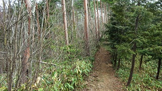思っていたより、人が登った形跡が無い。小さな赤いテープが一つだけ。山の標識や三角点探訪の札も下がっていない。藪の中にもテープ類は無かった。あまり登った人は居ないのかも知れない。 ![]() 上手い具合にお天気が良い。抹茶とコーヒーでゆっくりと休憩。14.20分出発。今度は南に、先日登った「間違いピーク」を目指す。 ![]() 又も藪漕ぎで、なるべく尾根らしい所を通って、一度鞍部まで降り、そこからまた登りだす。ようやく見覚えのある地点に出る。ここは東のほうが望める。先日見えなかった純白の白山が見えて嬉しい。 ![]() これはS女史よりメール添付の白山。上手く撮れている。白山は今頃が一番きれいに見える気がする。 ![]() 北の方に見えるのは遺水観音山で、その右肩の向こうに「大笠山」など県境の山が見える。 ![]() 15.05分、四日前に登ったピークに到着。ここが梅ノ木山だと思って昼を食べた場所だ。すぐに前回と同じ道を下山する。印に付けた赤いテープが頼りだ。 15.45分、車にたどり着く。この時期、知らない低い山を、道を探して歩くのは、なかなか楽しい経験である。今日もせせらぎの郷でお湯に漬かって帰る。 2009年02月24日(火)1回 梅ノ木林道終点より「梅ノ木山」未踏 この間、小松の国府の人に、教えてもらって登った「火燈山」は楽しかった。小松の里山記録が一つ増えた。獣道を歩くのも楽しかった。もう一つ、地図をながめていると、いつも目に付く山がある。「梅ノ木山」である。200mの低い山だが、地図にはきちんと載っている。冬だから近くの低い山にしようと、私が言ったら、相棒はすぐにこの「梅ノ木山」を持ち出した。彼も地図で見かけて名前を知っていたのだ。登山路の無い山は、あまり登らないが、それでも最近藪漕ぎで、阿稜山、瀧波山、火燈山と三角点を見つけた。木の葉の茂らない今が、登頂のチャンスだと、相棒と「梅ノ木山」に挑戦する事になった。 ネットで、登った記録が無いか調べても、何も見付らなかった。25.000分の地図では、東側に林道が通じている。沢町から梅ノ木山の下を通って、原町まで続いているが、まだ通った事が無い。又金平町の福祉施設、うめの木学園の横から、林道が入り込んでいる。こちらの方が入り易そうなので、ここから入る事にする。 ![]() 8.45.瀬領町の、せせらぎの郷で待ち合わせ。相棒を乗せて、布橋の方へ抜け、国道416号線を少し戻って、金平町の中を小松養護学校の方へ入る。学校の隣がうめの木学園だった。学園を過ぎたところで、右に林道に入る。途中の溜池までは舗装されている。その先は、梅ノ木林道と書いてある。しばらく走ると広場になり、その先は道があやふやとなる。ここに車を置く。9.15.歩き出す。 ![]() 右手に梅ノ木山があるはずだが、とりあえず林道の突き当りまで行ってみる予定。送電線の下を通り抜け、突き当りまで行ってみる。どの斜面を登ろうかと考えて、右手の斜面に取り付く。二つのピークの間の尾根まで登り、ここから左のピークに取り付く。 ![]() 段々と笹が背高く茂ってきて、完全なる藪漕ぎとなる。登り切ったら、東側斜面が杉林になっており、下刈りがしてあり、笹が低くて感じが良い広いピークである。梅ノ木山の南側から登っているので、方向を変えて、もっと北に進むべきだった。ところがようやく登り着いて、周りに高い山が無くて、どう見てもここが一番高い頂上だった。頂上だと思い込んでしまった。10.10分。 ![]() まず恒例の抹茶を頂き、三角点が無いか調べる。南斜面は雑木林で、その中の高みを藪漕ぎして、三角点が無いか調べるが無い。北側に緩やかな、長い尾根が張り出している。先まで行って見る。東側が杉林の中より覗ける。白山方面だが見えない。手前の山は、この間登った「火燈山」だと思うが、違うかな? ![]() その左に「奥獅子吼山」がみえる。これは間違いない。鉄塔が続いている。 尾根の先まで行ったら、その先に、一度降ってから登る、小さなピークが見えた。ここより大分低い。相棒はあそこまで行って見るか?といったが、大分下るのでやめとこうと言った。(今考えると、あれが梅ノ木山だった) ![]() 又、頂上だと思い込んだピークに戻り、食事を作って食べる。三角点ハンターや、ピークハンターの札がいっぱい下がっていると思ったのに、何も無い。やはり此処は梅ノ木山では無いらしい、と感じたが、記念写真を撮って下山した。林道を戻りながら、地図を眺めて方向を定めていると、やはり我々が登ったピークは、方向が少し違う。林道の送電線下を通るとき、送電線巡視路の入口に赤い布が下がっていた。リベンジはこの巡視路から入り、北側から登ろうと決めた。4日後の28日、12.30分、せせらぎの郷集合。と決めた。 帰りに、沢町から梅ノ木山の東側を通る、林道に入り込んでみた。沢原林道の表示があった。細いが舗装してあり快適に走れる。カーナビに梅ノ木山が現れ、開けた場所で、丸い「梅ノ木山」が見えた。山