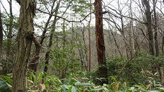 2009年04月18日(土)4回 「波佐羅三角点」の再訪 下の項より続く。三日前「波佐羅」三角点にたどり着いたが、藪で迷ってしまった。里に近い山なので、半分楽しんで迷ったのだが、それでも少し癪だ。お世話になった喫茶「花水樹」のマスターにお礼方々、もう一度確認の為登ってみようと思った。相棒は都合が悪くなり、一人だ。 ![]() 9.00.に「せせらぎの郷」より布橋に抜ける舗装路に入り、しばらくで右に「林道・湯の谷線」に入り、三叉路を左に「林道・千山谷線」には入り、続いて右に「瀬領町タキダン」に入る。国土地理院の地図に実線で載っている。行き止まり林道の、少し手前の道の広くなった高みの地点に車を置く。靴を履いていたら、夫婦の乗った軽四トラックが着いた。ここは自分の杉林で、手入れに来たという。三角点のあるピークを尋ねたが、知らないようだ。 ![]() この前と同じ藪に入る。高みまで登ったら、遠くに雪のある山が見えた。白山とは格好が違う。大笠山のようにも見える。ひょっとすると大日山かも知れない。早くも方向が定まらない。早くも迷ってるぞ。 ![]() それでも今日は遠くが見通せる所がある。こちらに平野が見える。気分的に楽だ。先日自分の付けたテープを頼りに、順調に藪を漕ぐ。最後に登りつめる尾根歩きは、案外歩きやすい。 ![]() 11.10.頂上到着。木の間から観音下方面の田圃が下に見える。また反対側は平野が見え、海岸線も見える。樹が無ければ展望の良い山だ。 ![]() 三脚を立てて証拠写真を撮る。ここまでわざわざ登る人は多く無いだろう。教えてくれたコマQさんに乾杯。 そのコマQさんが先ほど、前回迷った記事を見て、心配してメールをくれたが、私は楽しんで迷っているので心配ない。いつもの山歩きの近くに、三角点が在ると覗いてくるだけだ。遠くの山奥の三角点まで探すのは、方向音痴の私には無理な事は分かっている。それでも地図を眺めて、何処から攻めようかと考えているのは楽しい。 下りは無事下山できた。それでも、はてな? はてな? の連続である。地図とコンパスは持っていったが、全然使いきれない。おまけに地図は藪の中で落としてしまった。12.40分に車に到着。丁度、杉林の手入れの夫婦も戻ってきて、食事をしている。三角点は在ったかと聞かれ、お菓子を貰った。 ![]() このあと「せせらぎの郷」まで戻り、自動販売機でお茶を買って、「おくりび山」の近くの三角点「瀬領」を確認して、布橋町の「コーヒー&ギャラリー、花・水・樹」に寄った。ガラクタ、いや、骨董品がゴロゴロ置いてあり、屋根がドームになっている。 ![]() マスターにこの間、車まで送ってくれたお礼を言い、コーヒーを飲んで帰る。コーヒーは一杯ずつサイフォンで入れるから美味い。場所は「十二ヶ滝」の近くで、国道筋にある。 三角点「瀬領」探索は、「おくりび山」の稿に載せる。 2009年04月15日(水)3回 「西尾観音山」に続き「波佐羅点」探索 ![]() 午前中時間が空いたので、S女史がまだ登っていないと言う「西尾観音山」に登りに行く事になった。ここは簡単なので、ついでに近くにある、三角点「波佐羅」も確認してこようと言う事になった。瀬領の「せせらぎの郷」で待ち合わせ。布橋へ抜けて、9.05.観音下町の右奥の登り口に着く。登り口の大きな地蔵さんに手を合わせ、550段と言う石段に登りに掛かる。 ![]() 天気が悪くて時々パラパラと雨粒が落ちる。石段は滑りやすくて神経を使う。20分で頂上近くの岩屋の下の観音堂に着く。お賽銭をあげてお参り。彼女は信仰心が強い。財布を忘れた私は、お賽銭を立て替えてもらう始末。 ![]() ドウダンツツジだと言ったが、ウラジロヨウラクかも知れないな。花の名前は難しい。 ![]() 観音堂の反対側に広場がある。ここにも観音石像が置いてある。天気が悪くて展望無し。もどって、ご成婚記念の石柱がある大きな岩の横より、一番高い所に登り山名札を提げてくる。下りはすべるので、登り以上に神経を使う。 続いて「波沙羅三角点」を探しに行く。 波佐羅三角点の探訪 西尾観音山より見下ろすと、下を走る国道の向かい側の山の上に、三等三角点がある事になっている。その辺りでは一番高い山だ。山の名前は無い。三角点の名前は「波佐羅」となっている。波佐羅山にして一山増やそうかと思ったが、ここ西尾観音山の稿に、三角点情報を載せる事にする。 地図を見ると、観音下町の隣の、波佐羅町より大堤を越えて真下まで林道がある。ところがメールを頂いた事のある「コマQ」さんのHP記録では、「せせらぎの郷」から布橋に抜ける道路の途中から、長い林道に入り込んで最上部まで行き、西側から登っている。なるほどこちら側からだと、標高差があまり無いので登り易そうだ。西尾観音山から、その容姿を眺めてみたかったが、霧が掛かってよく判らなかった。 ![]() 西尾観音山から下りて、登山靴のまま車に乗って 「波佐羅」点を探しに行く。コマQさんの記事では、難なくすらっと登っ