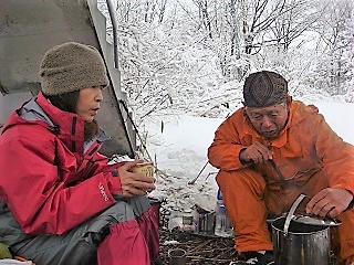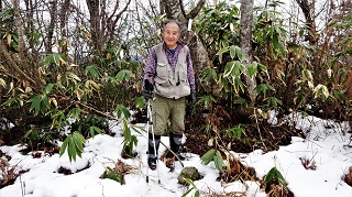 2009年03月14日(土)3回 八幡神社より「岳峰」往復 まだ高い山は雪があるので見合わせて、近くの山を歩いている。今回は「岳峰」。しばらく登っていない。気温が高かった後、昨日の午後より大荒れ。強い風が吹いたかと思ったら、急に寒くなり、雨が降ってきた。さすがのS女史より、大丈夫でしょうかね、とメールが来た。予報では段々雨が止んでくるというので、出発を1時間遅らして、10時に鳥越の道の駅で待ち合わせ。雨がじゃんじゃん降っているのに、S女史と老いぼれコンビが集合。しばらく車の中で写真交換と持ってきたアルバムを見て、空の様子見。 ![]() やっと集合したのだから、とにかく登ろうと、八幡神社に移動。神社の右の谷で、ダンプが入って工事中だ。覗くと砂防ダムが出来上がっている。神社の左の墓地の側に車を置く。神社の右に周り、工事現場を見ながら山に向かい、50mほどで左に、神社の裏山の方へ登山路が上っている。杉林の中を登ってゆくと、雪が積もってきているのでびっくりする。 杉林を抜けて、雑木林に入ると、細かい枝にも雪が積もり真に綺麗である。雨の中を無理して登ってきたご褒美である。 ![]() ![]() 「マンサク」の花が咲き出していたが、雪の中になっている。可哀想に。 頂上に近ずくと、ますます雪が深くなってくる。何時降ったのだろう。昨夜かな。今朝かな。今かな。 ![]() ![]() 12.15.頂上到着。雪は止んできた。雪に登ったのは初めてで、前回とは全然雰囲気が違う。建物が4っ程あって雑然としていたが、雪の中では意外と奇麗に見える。 ![]() 食事が出来るとは思って居なかったが、建物の一階が空洞の施設があった。真ん中で焚き火をした跡がある。その周りに座って、お湯を沸かして食事にする。やっと身体が暖まってきた。 ![]() 前回登ったときに、三角点があったことを覚えている。どの辺りだったか、よく覚えていない。今回は山名札を提げようと、持って来ている。この雪では三角点は見付らないかな、と思いながら食事を済ませて探しに行く。もう一つの建物のすぐ裏に、木に下がった赤い布を見付ける。近くに岳峰と書いた木札も見付けた。その近くに三角点は頭を出していた。木の下で、吹き溜まりで無いので良かった。欠けて頭が丸くなっている。うっかりすると只の石のようだ。彼女の足元にあるのが三角点である。近くの木の枝にプラスチックの札を下げる。