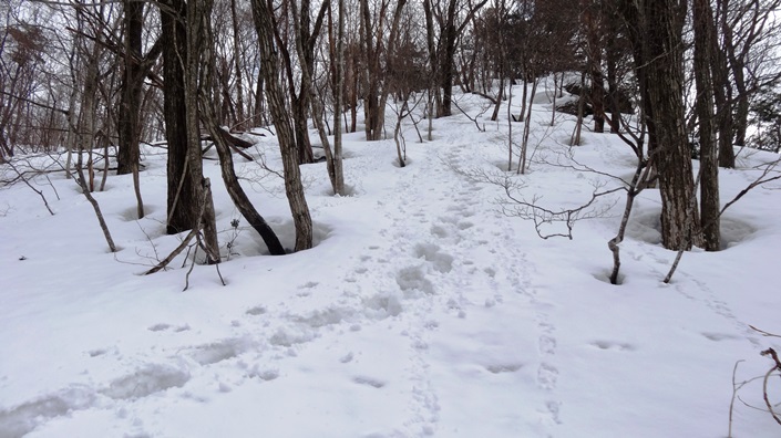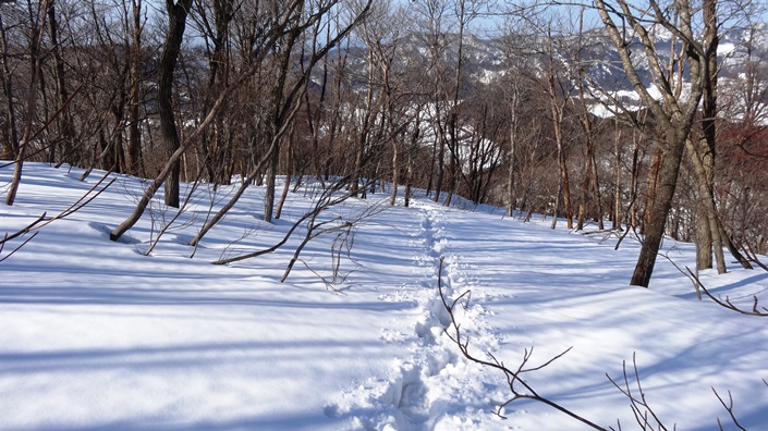 側に電柱があり、山の南側に電柱が続いている。電柱に沿って下から登山路が登って来ているようだ。こちら側より登れるのかも知れない。 ![]() 寒い中、頂上で1時間も遊んで下山に掛かる。途中、木の間より「大岳山」が見えた。大きな鉄塔が見える。あそこでいつも食事をする所だ。 14.10.車にたどり着く。相棒は登り足りないと、目の前に見える「二曲城址」に登りに行く。真に元気の良い相棒である。私は湧泉寺温泉に入って帰る。 |