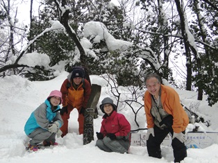 全員で集合写真。標識からすると1m60㎝ほど積雪がある。今日は女性コンビとN氏と、気だけ若い老人の4人。
