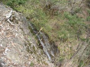 この小川が「入道の滝」になる。こんなに低い山なのに、どうどうと流れ落ちる滝に成る。この滝の横を降りるのが一苦労。巻き道が作ってあるが、以前この道は凄い藪道だったので、今回はあえて岩場を降りる道を選んだ。タイガーロープが張ってあるが、だいぶ古いもので切れるかも知れないと心配だ。おまけに支えの鉄の杭が抜けて、宙に浮いている。なかなか怖い。足の掛からない場所もある。やはり藪漕ぎのほうが安全だった。