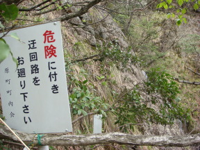 頂上で記念撮影をしてすぐ下山開始。滝上の岩壁を迂回して通る道があるらしいので、そちらを選ぶ。岩壁は迂回できるが、道が判らず急斜面を木の根につかまって滑り降り、危険の標識にたどり着く。
