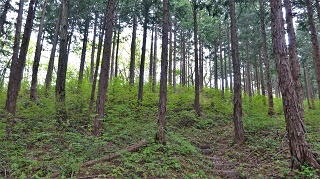 少し急な所を過ぎると、杉林になる。どこが登山路か判らない。なだらかな斜面を上へ上へと登る。