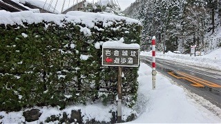 積雪の多いときは、道路からすぐ登れる山でないと入れない。昨日の「鳥越城山」に続き、今日は「岩倉観音山」である。国道わきの駐車場は雪の山だが、かろうじて車が置ける。民家の横の登山口は、川を渡るので危なそうだから、大事を取って、町はずれの赤い橋まで戻る。雪の壁をよじ登って、倉庫の前でカンジキを履く。10.10分出発。