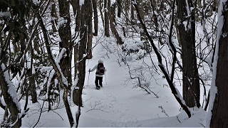 観音堂の方へ降りようと思ったが、斜面が急でスノーシューだと転げ落ちそうなので、元来た道を降り、さむらい道を降りてみた。道が判るか心配だったが、何とか判別がついて登り口にたどり着いた。