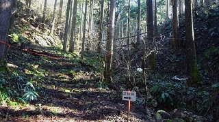 出郭の先に赤い標識があり、矢印の先の急な斜面に微かに踏み跡がある。あまり人が通らない様で判り難い。急な斜面を降り切ったら鞍部に着いた。12.34分。