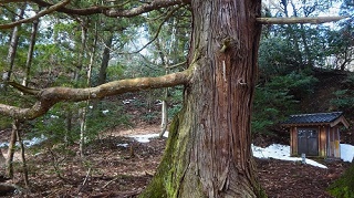 観音堂の前の広場に大きな杉が何本もある。観音堂といい、入道の滝といい、この山は宗教に関係しているようだ。