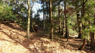 カモシカの居た地点から、左の尾根まで上がろうと斜面を登り出す。うまい具合に「馬駆け馬場の展望台跡」辺りに出た。屋敷跡を通る。11.15.観音堂の分岐に出る。新しい石の案内柱がある。登り口にもあった。登山路を整備したらしい。