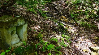 復帰して少し降りると「お梅地蔵」。江戸時代、女人禁制の時、岩倉観音の霊水を汲み、村人を助けた。
