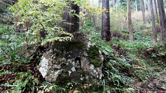 今まではすぐ暗い杉林に入るのだが、今回は様子が違う。明るいのだ。杉の木の枝打ちがしてあり下草も刈ってある。枝打ちした枝を運び出す為、登山路が車の入る林道になっていた。11.35分歩き出し、11.41分お梅地蔵。林道は左に曲がってゆくが、しばらくでまた合流してきている。そこが林道終点らしい。