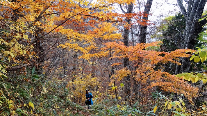 今年のブナの紅葉は遅いような気がする。記録的な長い猛暑の為だろう。今日は「指尾山」のブナ林を歩きに行く。8.00.道の駅瀬女で待ち合わせ。メンバーは3人。相棒K君とN女史。市ノ瀬へ向かう。今日は別当出合までの交通規制も終わったので、市ノ瀬から林道カーブを二つほど曲がった所にある、釈迦岳ヘの林道分岐の手前の、道の広い所に車を止める。8.50.。釈迦岳方面の林道は鎖があり、番人のおっさんが、工事中で発破を掛けているから通れないという。
