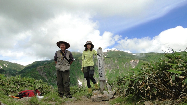 前峰で記念撮影。白山頂上がまだ望まれる。今日は思ったより天気が良かった。どうも梅雨が明けたようだ。