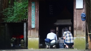 この村を過ぎるとすぐ「仏大寺霊水」に出ます。ここまで自宅より20分。ここの霊水は大人気。いつも水を汲む人が行列している。水場の隣この観音様の祠の裏に、手摺の付いた急な階段の登山口がある。