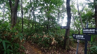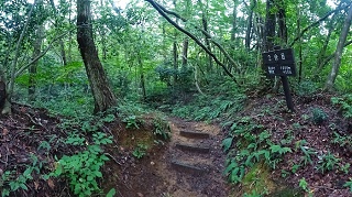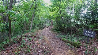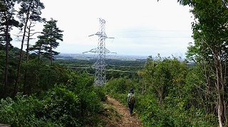 右の尾根の瘤を過ぎると、15分で57番の鉄塔に着く。「ササユリ」が多い。向かいの急坂を登ると、観音堂からの道に出る。分岐点に57番へ下る道の表示がある。鉄塔から25分で頂上に着く。下りは観音堂経由で30分で降りられる。