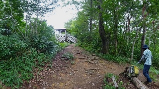 この観音堂の、右手の尾根を登ってゆきます。途中で、右へ下る送電線巡視路分岐を二つ過ぎると、まもなく頂上です。観音堂より25分くらい。道の真ん中に、欠けた三角点があり、横に立派な展望台が作られています。