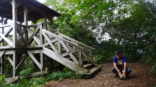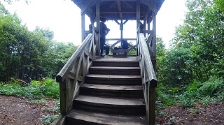 14時に、頂上展望台に到着。歩き出して45分かかっている。誰も居ないあずま屋で眺望を楽しんでいたら、気配がして振り向いたら犬が居た。