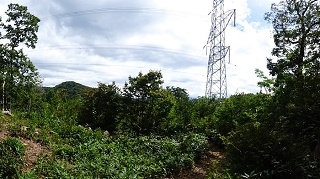 帰りに鉄塔巡視路から降りようと、分岐を左に折れる。分岐は二箇所あって、下の方の分岐を降りるのだが、何の気なしに、上の分岐を左に入った。鉄塔に出たがその先の道がはっきりとしない。前に降りた時の事を思い出して、無理やりに降りてみたが、藪漕ぎになってしまった。ようやく分岐を間違えたことに気付いて、藪を漕いで元に戻った。下の分岐があったが、今度は藪漕ぎで疲れたから、元来た道を戻った。