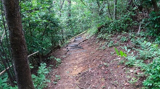 途端に急階段になる。危険の標識。なかなか長い。主としてプラスチック階段。お尻を着いて慎重に。