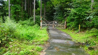 車を置き、階段状の登り口を見送って、そのまま林道を歩く。途中に、車止めの門があるがかまわず進む。やがて林道は突き当たり、左に折れ曲がる。少し進むと広い道は無くなる。ここまで15分。巡視路の58番鉄塔の矢印を進む。