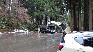 「遺水観音山」4回目登山。寒波がぶり返し、昨日は小雪が舞った。今日も天気予報は悪かったが、日がさしてきたので、急に思い立ち出かけてみた。仏大寺の観音霊水堂は、今日も車で一杯である。観音堂の裏に出発点の立て札がある