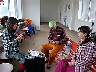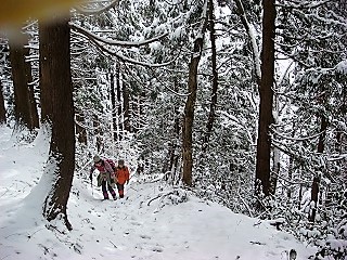 ![]() 案外簡単に見つかった。遊歩道から20mほど入った地点で、標識も案内も何もない。誰も気付かないだろう。近くの木に山名札を下げる。三角点があるので、ここを舟岡山の頂上と定めた。 ![]() 三角点で記念撮影をして、青年の家の裏に下り、縄文住居遺跡を見て、また舟岡山に入り、違う遊歩道を歩いて展望台に出た。 ![]() 10.00.一時間の散歩で車まで戻った。 今日はこれから、車で「倉ヶ岳」に上る予定だ。 2009年01月11日(日)3回 風吹峠-「後高山」-五万堂峠-山麓駅 昨年末クリスマス登山で女性コンビと、雨の中を鶴来の月橋町より「倉ヶ嶽」に登り、風吹峠より金剣宮に降りた。そのハッスルSN女性コンビよりメールで、またどこか連れて行ってください、と云って来たので、風吹峠より「後高山」に登り、獅子吼スキー場を横切り、五万堂峠(五万堂小屋)よりゴンドラ麓駅に降りることになった。成功すれば、10日くらいの間に「倉ヶ嶽」「後高山」「奥獅子吼山」と、縦走路でつながる事になる。 ![]() 9.00.にゴンドラ麓駅で待ち合わせ、車1台をここに置いて前回「風吹峠」より降りてきた砂防ダムに向かう。金剣宮の手前を右に折れ、鶴来朝日町の団地を抜けた所から雪が深くなり進めないので、案内板のある広場に車を置く。駐車場みたいな広場があるので、ここが正式の登山口なのかもしれない。9.15.に歩き出し林道を歩き9.35.にダムに着く。ここまでは雪が無ければ車で入ってこれる。 ![]() 前回の年末はほとんど雪が無かったが、正月の雪が残っている。杉林に雪が積もって幻想的だ。 ![]() 今日は用心してカンジキを持ってきている。谷を段々登り詰めていくと、積雪で登山路が判らなくなった。確か左の斜面をジグザクに登るはずだったが?。ようやく道を見つける。積雪のあるときは、よく登った事のある山でないと迷い易い。 ![]() ようやく風吹峠の林道に出る。林道は50cm以上積もっている。林道を横断して地蔵のある風吹峠に着く。10.30。お湯を沸かしてK宗匠のお手前で抹茶を一服。 ![]() 幾つもある小さい石像は雪に埋もれている。仏像ばかりでなく、いろんな人形も混じっている。誰かが置いたらしい。30分ほど休んで11.00.歩き出す。これから先は初めての道である。石像の横から獅子吼の表示がある。荒天の予報が今まで何とか持っていたが、小雪が降り出した。相棒はカンジキを装着。 ![]() 風が無いので枝に雪が積もり大変綺麗だ。道であるのか無いのか判らないが、歩きやすい所を通って7.8分で林道の三叉路に着いた。地図を見てきたので予定通りの場所に出た。地図を見ると左に降りる林道は「内川ダム」に続いている。直進する林道は獅子吼に続いている。 ![]() 獅子吼の方へ林道を150mほど進むと、右に標識があり登山路が始まる。この登山路は国土地理院の地図に記入がある。林道は左に大きく迂回している。歩くとうんと遠回りになる。 ![]() 11.15.登山路に入る。雪が深くなってきたので、カンジキを履いた相棒が先頭に立つ。ずーっと先のなだらかなピークに、丸い大きな電波搭が見える。あそこが後高山の頂上らしい。 ![]() 途中標識があるが、倒れているか壊れているものばかりだ。思ったより時間がかかって、12.30.電波搭の裏の「獅子吼白山比咩神社」にたどり着いた。吹雪でゆっくりとしていられない。すぐ近くのスキー場の大きな建物が雪で見えない。 ![]() ようやくスキー場の食堂でラーメンを注文し、持込のお握りを食べて一息。荒れてきましたのでゲレンデは注意して走行下さいの放送。なかなか吹雪は止まない。 ![]() 13.25.五万堂峠に向けてゲレンデの縁を下ってゆく。圧雪してあって歩きやすい。吹きさらしでが見通しが利かない。それでも滑っている人が居る。リフトは動いている。ゲレンデの一番下に休憩所とトイレがある。その間から登山路が奥獅子吼の方へ続いている。ここから先は足跡が無い。カンジキを履いている相棒にを先頭を頼む。雪深い尾根道を上下しながら進む。林に入るので風が無くなり有り難い。 ![]() 14.17.五万堂峠の小屋に到着。だいぶオンボロになってきた小屋だが有り難い。中に入ってコーヒーを沸かして飲む。一息入れて、私も今冬初めてのカンジキをつける。小屋の前で女性組が、新雪に倒れこんで大きな人型をつけて遊んでいる。子供に帰ったナ。 ![]() 雪は止んだ。新雪の道を降りるのは楽しい。ひっくり返っても滑っても怖くない。展望地点から見下ろす下界は白銀の世界である。 ![]() 同じ場所で、22日前の12/20日に奥獅子吼山に登った時の写真を載せておく。同じメンバーだ。 段々雪が少なくなって来たのでカンジキをはずす。下から登山者が一人登ってきた。今日は誰とも会わないだろうと思っていたのにびっくりだ、とその男性が云った。こちらもびっくりだ。我々も含めて世の中には、物好きな山好きが多く居るようだ。 後高山はゴンドラでも登れるので、なんとなく遠慮していたが、風吹峠より五万堂峠まで歩いた今日の道はなか