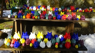 またみぞれが降ってきた。「おすわさん」と「さんのうさん」に初詣して帰る。 2008年01月02日(水)3回 初詣七社巡り「うずまき山」 ![]() ![]() 今年は、元日は天気が悪かったので寝正月。二日も天気が悪かったが、雨具を持って小松の七社巡りに出かける。去年とは反対回りにする。 「自宅」 より「日吉神社」まで10分。 「日吉神社」より「多太神社」まで8分。 「多太神社」より「熊野神社」まで15分。 「熊野神社」より「住吉神社」まで85分。 これは住吉神社の勧進帳を読む弁慶の像。 ![]() 「住吉神社」より「天満宮」まで50分。これは天満宮の芭蕉の句碑。 ![]() 「天満宮」より「稲荷神社」まで8分。 「稲荷神社」より「公園うずまき山」まで10分。これは公園の写真。 ![]() 「公園うずまき山」より「諏訪神社」まで8分。 これは諏訪神社の「弁慶お手植えの松」 「諏訪神社」より「自宅」まで8分。 合計三時間半の歩きである。 2007年01月01日(元日)2回 初詣七社巡り「うずまき山」 ![]() 2007年元旦。今年も天気が良い。去年に倣って小松七社巡りの初詣に出かける。登山靴を履く。午前10時10分発。 10時18分。第1社「お諏訪さん」着。入口に芭蕉の「しほらしき名や小松吹く萩すすき」の句碑が立っている。元禄2年7月27日に奥の細道の旅の途中、芭蕉と曾良は、折から祭礼のこの神社に詣うでている。曾良の日記には快晴と載っている。二人の歩いた距離を考えると、これから歩くのは極々少しだ。 ![]() 10時34分。芦城公園内の「うずまき山」に到着。この立札があるからこのホームページに無理やりに載せている。 向うは我が母校、小松高校だが卒業以来とんとご無沙汰している。 ![]() 10時43分、第2社「お稲荷さん」に到着。殿内で巫女が舞っているが、社前には誰も居ない。ちと寂しい初詣である。 ![]() 10時52分、第3社「天神さん」に着く。ここは人が多い。 境内に能舞台がポツンとあるのは、能楽師として少し寂しい。京都の神社の能舞台などでは、元日に翁などが奉納されているようだが。 ![]() 天満宮の裏に出て、梯川の右岸堤防をを河口まで歩く。振り返ると白山を中心に左は医王山から、右は富士写ヶ岳までの大パノラマが望める。 安宅の橋を渡って11時36分、第4社「住吉さん」に着く。ここは一番人が多い。長い行列だ。側を通ってサットお参りして今度は梯川の左岸堤防を歩く。 ![]() 高速道路の下を過ぎると、前川に掛かる逆水門に出た。この門に掛かる橋を渡る。前川には渡り鳥が羽を休め、向うに白山が真っ白である。魚を釣っている人が居る。田圃の中の道を歩く。 ![]() 12時56分。我が家の墓に到着。亡くなった両親と奥さんに参る。元日でもお参りの人が多い。遠くからの里帰りの人だろう。 ![]() 第5社「イボ池さん」はすぐ近くで13時05分に着く。境内の池の水をイボに付けるといぼが取れると言われている。子供のときに汲みに来た記憶がある。汲んで帰るときは後ろを振り向いてはいけないとか言われたな。イボが取れたかは記憶に無い。 ![]() 13時17分、第6社「八幡さん」に着く。入口に芭蕉の石像がお迎え。この神社には実盛の兜が奉納されている。能楽堂もある神社だが、初詣の人は少ない。 ![]() さて最後は、第7社の氏神様の「山王さん」である。13時30分に参拝を終え、神社の左に周ると、「芭蕉留杖ノ地」の碑がある。芭蕉は此処にも寄っているのだ。 自宅に13時40分到着。自宅を出て3時間半のウオーキングである。この間靴紐を締め直すのに一度座っただけだ。ゆっくりとであるが歩き詰めであった。 2006年01月01日(元日)1回 初詣七社巡り「うずまき山」 ![]() 2006年元日。珍しく日本晴れ。いつもは寝正月なのだが、一念発起して小松の神社7社の、歩き初詣に出かける。 ![]() 距離が長いので登山靴を履く。自宅より12分で市役所前の芦城公園に着く。里山に載せるつもりは無かったが、築山の頂上に「うずまき山」の標識があった。そこで無理やりにここに取り上げた。正月だから大目に見て欲しい。 ![]() 御亭から見たうずまき山。池の向こう、滝のある築山である。標高不明、15m位か。 ![]() 公園より13分。第1社の大川町の「葭島神社」に着く。小松城内にあった稲荷明神が合祀されている。通称「いなりさん」。 ![]() 10分で次の第2社天神町の「小松天満宮」に着く。通称「てんじんさん」。学問の神様は大人気で、お参りするのに行列である。境内に能楽堂がある。 ![]() さてここより梯川の土手を河口に向かって歩く。天気は良し。風は無し。振り返ると山が一望。右より富士写ヶ岳・大日山・鈴ヶ岳・兜山・倉掛山・動山。鷹落山・大倉岳。別山・白山・笈ヶ岳、大笠山・奥獅子吼山・遺水観音山、左端は倉ヶ岳である。だいぶ見分けがつくようになった。天満宮より1時間で第3番目の安宅町「安宅住吉神社」に着く。通称「すみよしさん」。2社より4・5キロはある。テレビ義経の影響か人でいっぱいだ。 ![]() さてここからが滅茶苦茶遠い。小松市の南の方なので、田圃の農道を行く。我が家