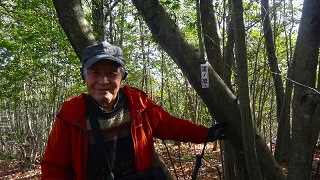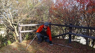 ![]() この写真の先に三角点がある。杖は蜘蛛の巣を払うのに必要品だ。それに藪蚊に閉口する。 ⑥▲「吉森」三等三角点 ![]() 次の三角点⑥番目は、「末寺山」である。今日のパーティの二人は、まだ三角点を見ていないので連れてゆく。 佐野からはすぐ近くだ。いつもの登り口から入り、東屋で藪蚊に悩まされながらコーヒータイム。この時三角点札が無いことに気付き、車まで取りに戻るが無い。 ![]()