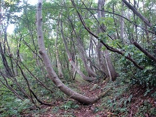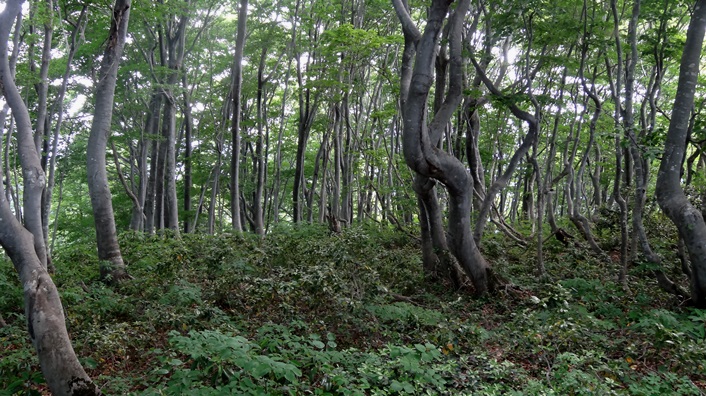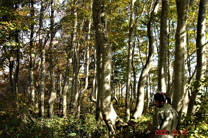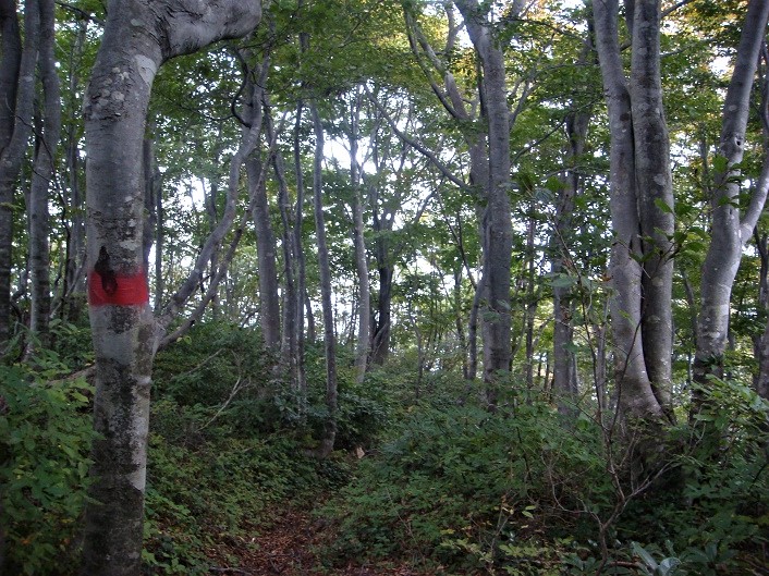 ![]() 相棒も藪に入ったが、いつの間にかいなくなった。矢印の方へ降りたら、何の事は無い登山道のブナの赤い印のある分岐だった。あの時分岐を左に入ればすぐ三角点だったのだ。相棒は私のリュックの所で待って居た。相棒は三角点が見付からずにここに来ていた。また戻って写真を撮る。 ![]() 駐車場から順尾山までは、標高差が無く歩きやすい。三角点のある「上順尾山」から地図上に「順尾山」と記入されているピークまではだいぶ離れている。途中から富山県との県境になる。笹に花が咲いていた。 ![]() 10.25分に「順尾山」頂上到着。単なる登山路の通過地点で、標識が無いと頂上と気が付かないだろう。頂上の手前のブナ林に日陰を求めて、抹茶休憩。ガラスの茶碗にポットの冷水で、抹茶を点ててくれる。いつも有難う御座います。 ![]() 休憩が住んで出発、8分ほど歩いたら尾根の突端で「大倉山・奥高尾山」の分岐に着いた。ここから「浅犀みくまりの道」が奥高尾山まで続いている。 「みくまりの道とは、浅野川と犀川に等しく、水を分ける尾根道(分水嶺)という意味です。平成二十二年十一月 日本山岳会石川支部」と書いてある。しゃれたネーミングで人気が出そうだ。 大倉山は以前にここから登った事がある。ここから1時間半の標識もある。今日はやめておこう。 ![]() みくまりの道に入る。ブナの林の綺麗な道だ。急坂注意と札が下がっている。ロープも下がっている。 ![]() 「ユキザサ」 ![]() 左に犀川ダムの覗ける所が一ヵ所ある。茂ってちょっとしか見えない。「順心坂(急坂注意)」の札の掛かった登りになる。 ![]() 地理院地図に、826mと記入のあるピークに到着。登山路よりちょっと右に入る。広いなだらかなブナ林の中である。11.30分。 ![]() 「心野谷山(しんのだんやま)」と名付けたらしい。日尾峰とも書いてある。今日は暑い日だが、ブナの林歩きが多いので、あまり暑さを感じない。 休憩して出発。素敵なブナの林を降って行く。 ![]() ![]() 次のピークが見えてくる。地図を見ると、みくまりの道には大きなピークが二つある。 ![]() 12.35分に、地図に775mの記入のあるピークに到着。「西谷山」と書いてある。このピークも登山路を右に少し入る。さっきの心野谷山とまったく同じ雰囲気の、ブナ林の頂上である。 ![]() 奥高尾山への登りに掛かると、富山県境の山が見えた。大門・高三郎、辺りか?。 ![]() 13.15分に奥高尾山に到着。この場所は何度も来ているので見覚えがある。浅犀みくまりの道はここまでで終りある。 ![]() 「順尾山」より「浅犀みくまりの道」を初めて歩いて「奥高尾山」に13.15分に到着。みくまりの道はブナ林の続く気持ちの良い縦走路だった。途中に「心野谷山と「西谷山」の二つのピークがある。ピークハンターの相棒は、登山山名が二つ増えて大満足。 ![]() この奥高尾山ピークは医王山の方に展望があり、いつも休憩する。一番高い所は吉次山の方へ少し進んだ地点だが、そこは展望が無い。 ![]() 高尾山の上に医王山が見え、左にキゴ山と戸室山が見える。 ![]() 14.00時に高尾山まで降りて来た。三角点で一休み。 ![]() 「チゴユリ」 ![]() 「ヤマボウシ」 ![]() 高尾山から駐車場までは中々遠かった。15.15分にようやく到着。 相棒の車で、順尾山の駐車場まで、私の車を取りに行く。 **次回登山は、6/8能登の「宝立山-高州山-鉢伏山」へ** 2009年10月06日(火)5回 駒帰町より「吉次山」を往復 ![]() 10日ほど前「高尾山」へ登った。その時尾根続きの「吉次山」にも、もう一度登ろうと思った。前に登ったとき「少年の森登山口」の標識があり登山路が合流していた。相棒に聞いたが彼もまだ歩いたことが無かった。すぐネットで調べたら「娚杉メオトスギの少年の森」から登山口があると判った。翌日、金沢能楽堂での仕事が早く終わったので登山口の確認に出掛けた。能楽堂から山に向かって一直線、途中湯涌温泉への道を左に見送り、末町を通り駒帰町から「少年の森」の石の案内板で左折して林道に入りキャンプ場に着いた。ボーイスカウトがキャンプをしていた。トイレを借りて係員に登山口場所を聞いたら教えてくれた。キャンプ場の前の林道をそのまま、1キロ-1.5キロほど直進した先の、大きな鉄塔の先に登山路の標識があった。 小松からS女史を乗せ、8.40.兼六園隣の能楽堂で相棒のK君と待ち合わせ、9.20.に大きな鉄塔の前に車を置く。 ![]() 9.30.鉄塔の下を横切ると吉次山登山口の標識がある。赤松の林を下ってゆく。鉄塔の巡視路でもあるようで、広く手入れがされている登山路だ。 なるべく直進する道を行く。分岐には木の札の標識か、太い木に赤いペンキのしるしがある。太い木の赤いマークは、頂上まで続いていて頼りになる。 ![]() ![]() ![]() ムラサキシキブ アキノキリンソウ ヤマシロギク ![]() 最後の鉄塔をすぎると、ブナの木が段々多くなる。鉄塔を過ぎると登山路が藪化していないか心配だったが、実によく手入れされている。しかもごく最近手入れをした感じ