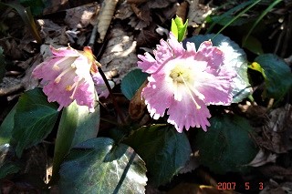 石観音の祠の中に、登山ノートが入っている。記入者の中に「コマQ」さんの書き込みが在った。今年6月に登っていらっしゃる。自称三角点ハンターのコマQさんのページは、時々読ませて頂いているし、時々参考にして三角点探訪もしている。このコマQさんは一週間ほど前に、手取川河口を自転車で出発。別当出合より白山を往復、又自転車で海岸まで。つまり18時間で海から白山を往復した凄い人である。 この山の「大高尾山三角点」は私のほうが先に探訪していることになる。奥医王山は雲が掛かって見えない。戸室山と金沢平野がかろうじて見える。30分休憩で抹茶タイム。山でお菓子を食べて抹茶を頂くとすぐ元気が出てくる。 ![]() 11.00.出発。ブナの林が多くなる。11.35.順尾山の分岐点に出る。 ![]() ここで昼食の予定。荷物を置いて50mほど先の頂上標識まで行く。「奥高尾山843.m」の標識が建っている。見通しは利かず。私の案内本は標高841.mとなっており、2.mの差がある。リュックまで戻って昼食。 ![]() ![]() ここのほうが展望があり気持ちが良い。きれいなキノコがあちこちに顔を出している。 さっきまで居た前高尾も霧が晴れて見えてきた。 一時間以上ものんびりと休憩。女性と一緒だとコーヒーからデザートの果物まで出てくる。 ![]() ![]() 13.00.下山開始。「ムラサキシキブ」が咲いていた。 のんびりと遅れて降っていたら、前方で騒いでいた。蜂に刺されたという。見ると登山路横の大きな杉の木の、10mほど上の幹の穴から、大きな蜂が出入りして、幹をいっぱい歩いている。スズメバチではなく普通の蜂の大型の黄色い縞模様の蜂だ。 ![]() 二人は通り過ぎて向こうで蜂を払っている。こちらに二人残された。登ってきたときにこの杉の木の横を通ったが気が付かなかった。まずS女史が走り抜けた。向こうで蜂を払っている。あそこまで行けば蜂は追ってこないようだ。蜂が飛んでいないのを確認して私も頭を低くして横を通ったら、頭の上で蜂の唸るのが聞えいつまでも付いてくる。仲間のところへ駆け込み背中と帽子に付いた蜂を払ってもらう、背中に4.5匹と帽子1匹付いていた。軍手の上から左の人差し指の根元が刺された。応急に虫刺されの薬を塗ってもらう。 途中の鉄塔の下の広い場所で刺されたところの確認。全員手に刺されていた。赤く腫れて来た。一番前を歩いていたNさんが一番痛そうだ。14.05.車まで到着。湯涌の白鷺の湯に入ろうと言っていたのに、蜂騒ぎで止めにしてすぐ帰った。15.40.小松の自宅着。私は腫れた所が痒いくらいで済んだが、女性陣は薬局によって痛み止めを貰ってきたと言っていた。 皆様もご注意。登り途中の鉄塔から前高尾までの、登山路の左の大きな杉の木。登りでは巣は見えないが、通り過ぎると幹の上のほうに穴が開いて蜂が出入りしているのが見える。 翌日の新聞に「湯涌町の山林でハイキング中の女性、スズメバチに10数ヶ所刺されて病院に搬送」と出ていた。26日11.50.頃とか。まさか同じ蜂と言うことは無いでしょうね。 2007年05月03日(木)3回 「吉次山」より「高尾山」を縦走 ゴールデンウイークは山歩き三昧である。今日で3日間連続の山歩きである。今回は「吉次山」に登りぐるりと「高尾山」まで縦走の予定である。以前に高尾山から奥高尾まで行ったことがある。 K君と8時半に湯涌温泉のバス停待ち合わせ。小松の自宅より加賀産業道路を走り、そのまま金沢の山側環状線になる。大きなトンネルを越えて、右に湯涌温泉の表示がある。戻るような感じになるが新しい橋を渡って温泉まで一本道である。1時間を切るくらいで待ち合わせ場所に到着。温泉街入口の待ち合わせ場所バス停は、竹下夢二館の駐車場も兼ねており、前に公衆トイレがあり便利である。この駐車場の上から右に林道が始まっている。 ![]() ![]() 少し前の新聞に湯涌温泉の玉泉湖の水芭蕉が咲いたと載っていた。登山の前に、温泉街を抜けた突き当りの玉泉湖に確認に行く。徒歩で小さな湖の左より湖岸を回ると、その先に水芭蕉園があった。 ![]() どうも自然ではなく植えたものの様である。盛りは過ぎて大きくなりすぎている。湖を一周して戻り、バス停まで戻り林道に入る。 白雲楼ホテル跡、旧江戸村の横を通り、途中右に降りるように畠尾町に至る道が分岐している。この分岐の先に大きな駐車場がある。さらに進むと林道は赤い大きな鉄塔の下で行き止まりになっている。ここにK君の車を置く。9.00時だ。 ![]() 今度は私の車で、林道途中の大きな駐車場の先の分岐を畠尾町の方へ下る。畠尾町の手前で左に林道に入る。曲がり角に登山路の案内がある。道は直ぐにガタガタの悪路となる。しかも結構長い。底をガリガリと擦る。左の谷を隔ててこれから回る高尾山が見える。林道はまだ続いているが、車が傷みそうなのでUターン出来る所で車を回し路肩において歩き出す。9.50分。 ![]() 林道を20分ほど歩いたら終点の陶石採掘場跡に着いた。露天掘りなのか、辺りは開けて車は何台
