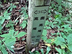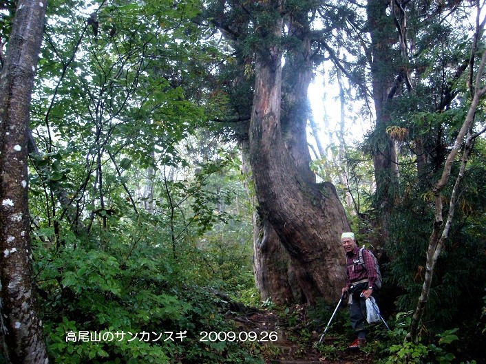 ![]() ![]() お湯を沸かしてゆっくりと昼食。広場の隅の木に郵便受けがあり、中に登山ノートが在り自由に書いて下さいとある。前回、2007.5.3.の自分の書き込みを見つけた。 今回も書き込む。金沢・K・73歳。小松・М・72歳。小松・S女子・?歳。以上三名。 ノート書き込みを読むと、四月後半に登って、花がきれいに咲いていて感動したと言う記事が多い。我々も「イワウチワ」の大群落を見つけて、春に又登りたいと思ったものだ。高尾山の方へ300mほど進み、大門山や大笠山や高三郎山の見える地点まで行って見たが、曇っていて確かとは判別出来なかった。13.15.下山開始。 ![]() ![]() ![]() これは「カメバヒキオコシ」。なかなか覚えられない。 ![]() きれいな杉林を過ぎ、赤松林をだらだら登ると鉄塔が見えてきて、車に到着。14.45.分。 駒帰町の林道入口を反対にちょっと山に向かうと、右に「犀鶴林道」の起点がある。前に一度通った事がある。ここを通って鶴来町に出ようと思ったが、今回はやめにして戻った。 2009年09月26日(土)4回 湯涌より「高尾山」を往復 去年の7月末に金沢の奥座敷湯涌温泉あたりを、大水害が襲った。私自身はその時期初めての外国の山歩きに出掛けていたので全然知らなかった。大変な水害だったらしい。そんな訳で林道が寸断されて高尾山や順尾山や大門山が登れなくなった。あれから1年、「高尾山」が登れるようになった事を知った。順尾山や大門山は、今でも林道は入れぬようだ。 ![]() 今回は4名全員参加。小松より7.45.車1台で出発。8.45.湯涌温泉町中の高尾山の林道分岐にある駐車場で相棒K君と待ち合わせ。バス停があり向かいにトイレがある。ここは「夢二館」の駐車場かな。すぐ林道に入り、江戸村のあった所を過ぎると、舗装してあるが道は細くなる。突き当たりの大鉄塔の下の駐車場に9.00.到着。この駐車場は狭いので、入れるか心配だったが車は一台もなかった。ここには5.6台しか置く事が出来ない。初めて鉄塔の下まで登ってみた。曇っていて周りは良く見えなかった。ここら当たりは送電線銀座だ。 ![]() 9.00.出発 この山は良く登られている里山みたいな感じ。ブナの木も多く、感じが良くて好きな山だ。「カヤ」に実が成っている。 ![]() こりは「オオアキギリ」 ![]() 後方で声。コケを発見。しかも「舞茸」らしいと言う。野生の舞茸もあるのだ。匂いも舞茸だ。おきな株が二つあった。 ![]() これがその舞茸である。女性群が持ち帰って食べたら大変おいしかったらしい。ここ数日お天気が悪かったので、いろんなコケが発生している。コケには知識がないので、私はコケには近寄らないようにしている。この舞茸も毒きのこでなくて良かった。 大きな野生の杉の木がある。急坂を登りきると緩やかになり、左に前高尾山への分岐に出る。100mくらいで前高尾山にでる。10.30.着。 ![]() ![]() 小さな広場で真ん中に三角点が鎮座していてベンチがあり、ガラス扉の堂の中に、手が8本の石の観音像が祭られている。手の数はちゃんと数えた。湯涌温泉の守り佛だとか。 ![]()