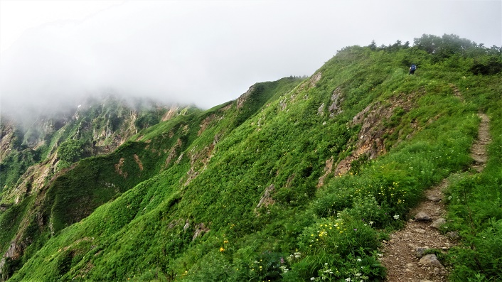 2021年07月29日(木)7回 第1日・砂防新道で南竜小屋泊 「別山」は二度登っている。チブリ尾根からどなたでも日帰りで登って居らっしゃる。私もどうしても登りたくて15年前の2006年に、1日目は南竜山荘に一泊、翌日「別山」を往復してもう一度南竜山荘に一泊、3日目に砂防で下山した。二度目は2013年にH女史と南竜山荘に一泊。翌日別山からチブリ尾根を降りた。南竜を4時に出て市ノ瀬17時着の、13時間の恥ずかしい大記録を樹立している。しかし大満足だった。今回S女史が別山に登りたい登りたい登りたいと言うので、南竜で一泊、翌日S女史が別山を往復してくるのを、南竜で待ち一緒に砂防を降りる計画を立てた。しかも帰りのバスが無くなるのを想定して、別当出合までバス規制のない日に乗り入れる事にした。 ![]() 別当出合まで自宅より1時間40分ほどで入れる。上の駐車場に車を置く、22.30分。30台ほど留まっている。下の大駐車場は空っぽのようだ。小雨。暑い。何とか寝る。朝、明るくなったら車から人が出てきて出発してゆく。我々も6時に出発。 ![]() 駐車場から登山口のバス乗り場まで上がる。 ![]() 建物で、検温と名前記入。トイレを使って長い吊り橋を渡る。年を取るとこんな吊り橋も怖くなる。 ウバユリ ソバナ オオハナウド ![]() ![]() ![]() ![]() 一方通行の岩場を登って、ブナ林を登って行く。 ![]() 7.50分。中飯場。自衛隊のパーティーだな。 ![]() ダケカンバ。 ![]() 覗という地点。谷が覗けたが今日は何も見えない。 ホトトギス ミソガワソウ カニコウモリ ![]() ![]() ![]() サンカヨウの実 センジュガンピ ハリブキ ![]() ![]() ![]() ゴゼンタチバナ キヌガサソウ ヤマハハコ ![]() ![]() ![]() ミヤマキンポウゲ ユキザサ ハリブキ ![]() ![]() ![]() ![]() 11.10分。甚之助避難小屋に到着。天気が悪いがベンチで昼食 オンタデが咲いている。 出発。ちょっとガスが晴れた。谷の底が見える。あの辺りが出発地点だな。 ![]() バイケイソウ アキノキリンソウ ![]() ![]() ![]() 昼食を取った甚之助避難小屋が見えた。南竜分岐に到着。12.30分。 ![]() ヨツバシオガマ イブキトラノオ ハクサンフウロ ![]() ![]() ![]() メタカラコウ エゾシオガマ シモツケソウ ![]() ![]() ![]() イブキトラノオ カニコウモリ テガタチドリ ![]() ![]() ![]() コバイケイソウ イワイチョウ ![]() ![]() ![]() 水平道を行く。南竜山荘か見えてきた。 ![]() S女子と静岡の80歳の男性、二人とも花好きだな。 ![]() クロユリ シナノキンバイ コイワカガミ ![]() ![]() ![]() クルマユリ レイジンソウ マイヅルソウ ![]() ![]() ![]() みうすぐだ。14.00時。小屋で検温。二段の部屋は一人づつ仕切ってあった。インナーシュラフが必要との事で、買って持ってきた。夕食と朝弁付きで11.000円。申し込みしてある。 ![]() 一休みしたら晴れてきた。二階のテラスから野営地の上に別山への道が見えた。油坂の頭だな。別山はあそこを越えてゆく。すぐに散策に出掛ける。野営地へ登る橋を渡るとハクサンコザクラの群生地がある。 ![]() ハクサンコザクラ ニッコウキスゲ モミジカラマツ ![]() ![]() ![]() テガタチドリ アオノツガザクラ チングルマ ![]() ![]() ![]() ![]() 野営地は新しい建物を建て替え中。ヘリがピストンで荷揚げをしている。 ハクサンコザクラの群生地より南竜山荘。17時から夕食。食堂は一人づつ仕切ってある。20時で消灯、真っ暗になる。ヘッドランプ必要。すぐ寝る。 ![]() 下に続く。 2021年07月30日(金)7回 第2日・別山天池往復-砂防下山 今日はS女史の別山往復の間、南龍ヶ馬場のお花畑でのんびり過ごし、戻ってきたら一緒に砂防新道を降りるつもりだったが、ちょっと欲を出して途中まで同行しようと考えた。 ![]() 少しでも早く出発したい。朝食は昨日のうちに弁当で貰った。余計な荷物は乾燥室に預けた。5時に出発だ。帰りはここで12時から13時の間に落ち合おうぜ。 ![]() 霧が立ち込めている。 ![]() キンポウゲの咲く道を出発。 ![]() 橋を渡ってすぐ、野営地を通らない登山道の入口がある。ここから登る。 ミヤマシシウド イワイチョウ チングルマの綿毛 ![]() ![]() ![]() 池塘があり日本庭園みたいな所を通る。庭園を抜けると、一度川を渡るために谷の底まで大下りする。 ![]() ![]() 谷底近くまで降りて道端で朝食だ、7.10分。お湯を沸かして貰って熱いコーヒーと味噌汁。豪華だな。 ![]() イブキトラノオ。赤谷の源流は飛び石で渡れる。ここから油坂のジグザグの急登となる。油坂はお花畑であり、楽しく登れる。坂の途中でS女史に先へ行ってもらう。頑張って別山迄行ってください。 ベニバナイチゴ マルバダケブキ テガタチドリ ![]() ![]() ![]() ダイモンジソウ オトギリソウ ヨツバシオガマ ![]() ![]() ![]() ナナカマド シラネニンジン ヤマブキショウマ ![]() ![]() ![]() コバイケイソウ ![]() ササの花 キバナノコマノノツメ ナナカマド ![]() ![]() ![]() コバイケイソウ オオヒョウタンボク ![]() ![]() ![]() 油坂の頭は過ぎたようだな。なだらかな稜線になった。 ![]() ミヤマキンポウゲ コバイケイソウ カライ